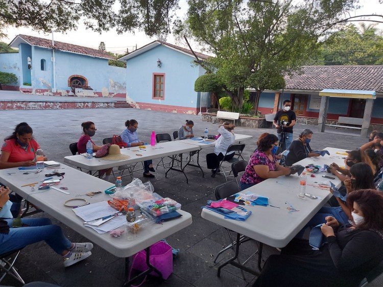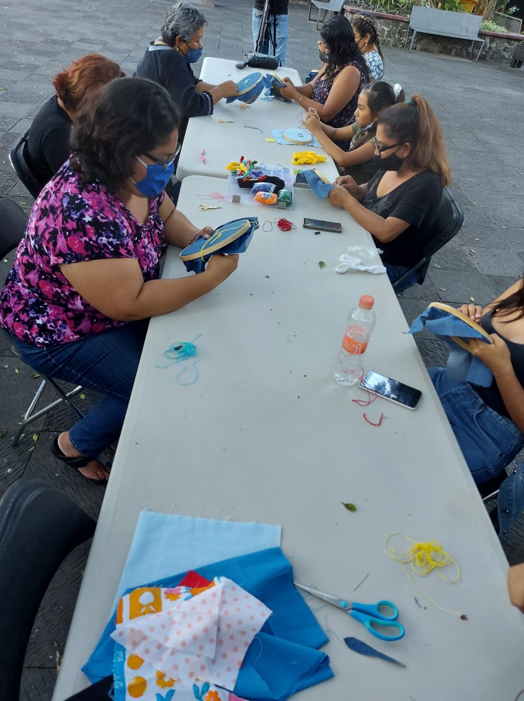 En el taller de bordado Tenango, las participantes relacionan elementos de la naturaleza con reflexiones sobre sus propias historias, miedos, alegrías y deseos. Con bordado Sashiko las mujeres reflexionan sobre sus pisadas en el mundo, su manera de habitar y las cicatrices o heridas que las han marcado.